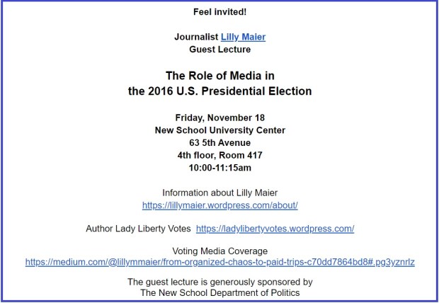2016: Lilly Maier (New York University School of Journalism, Founder Lady Liberty Votes, Ludwig Maximilians University of Munich) at The New School Department of Politics, New York, New York, USA, November 18, 2016.